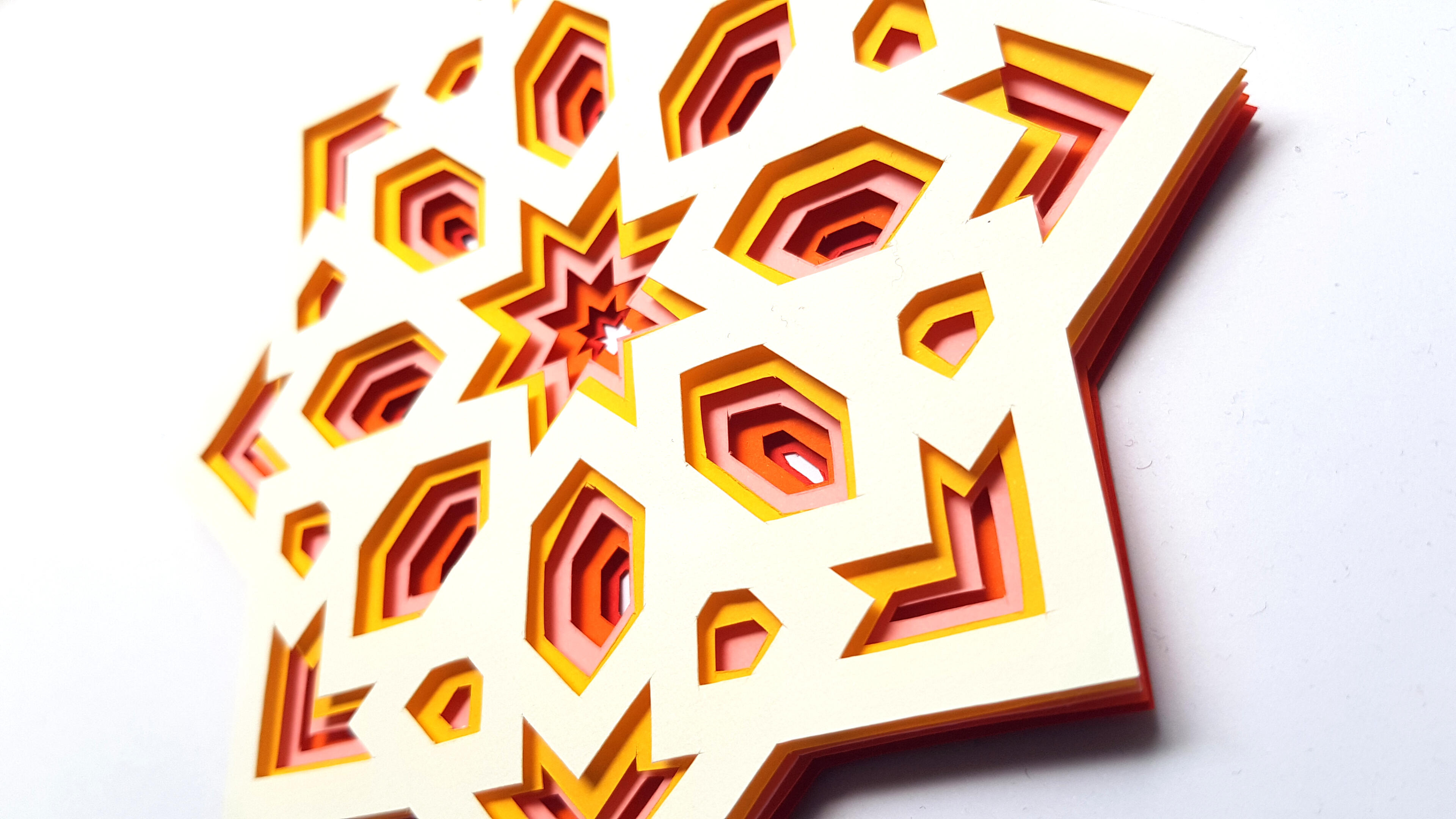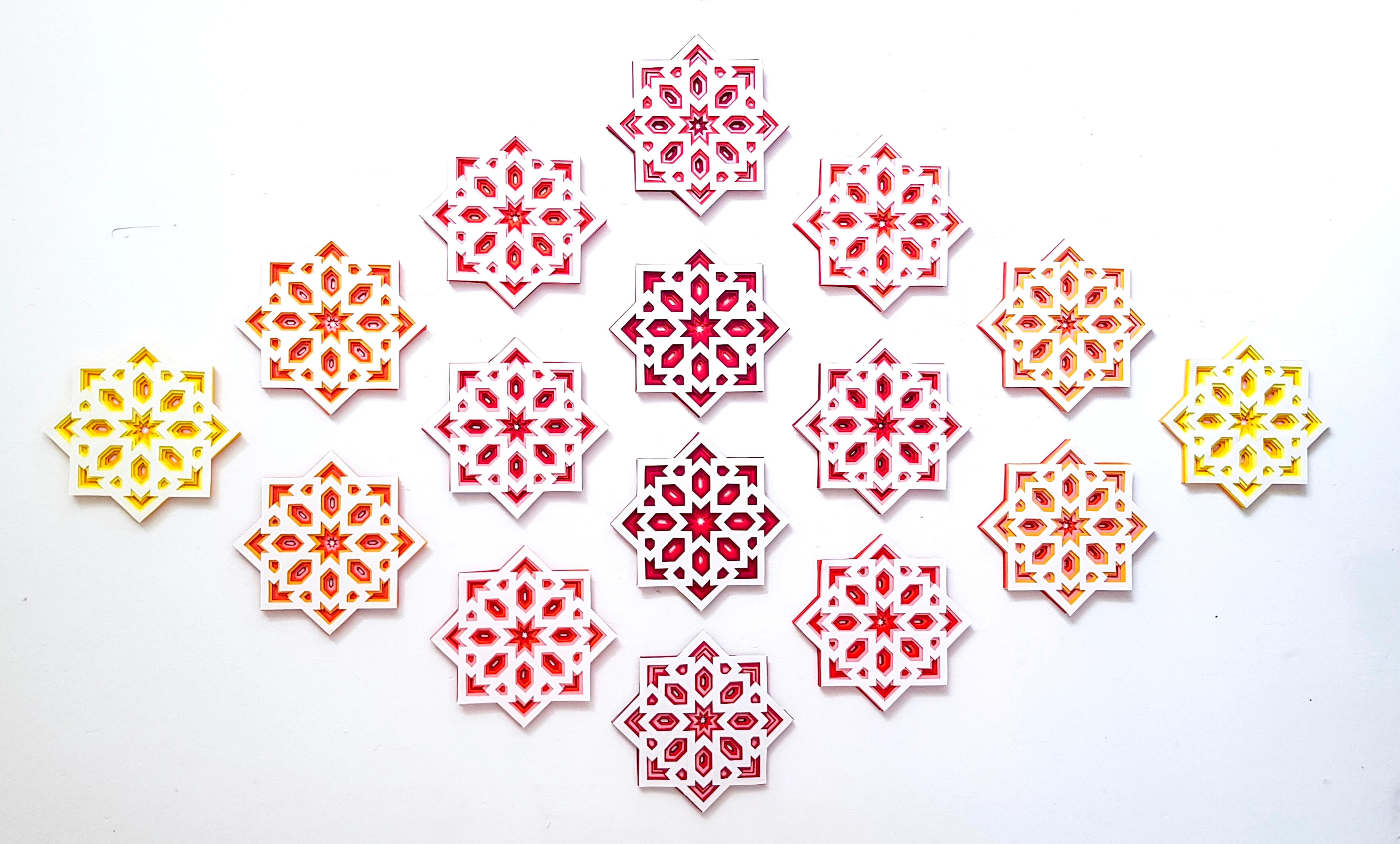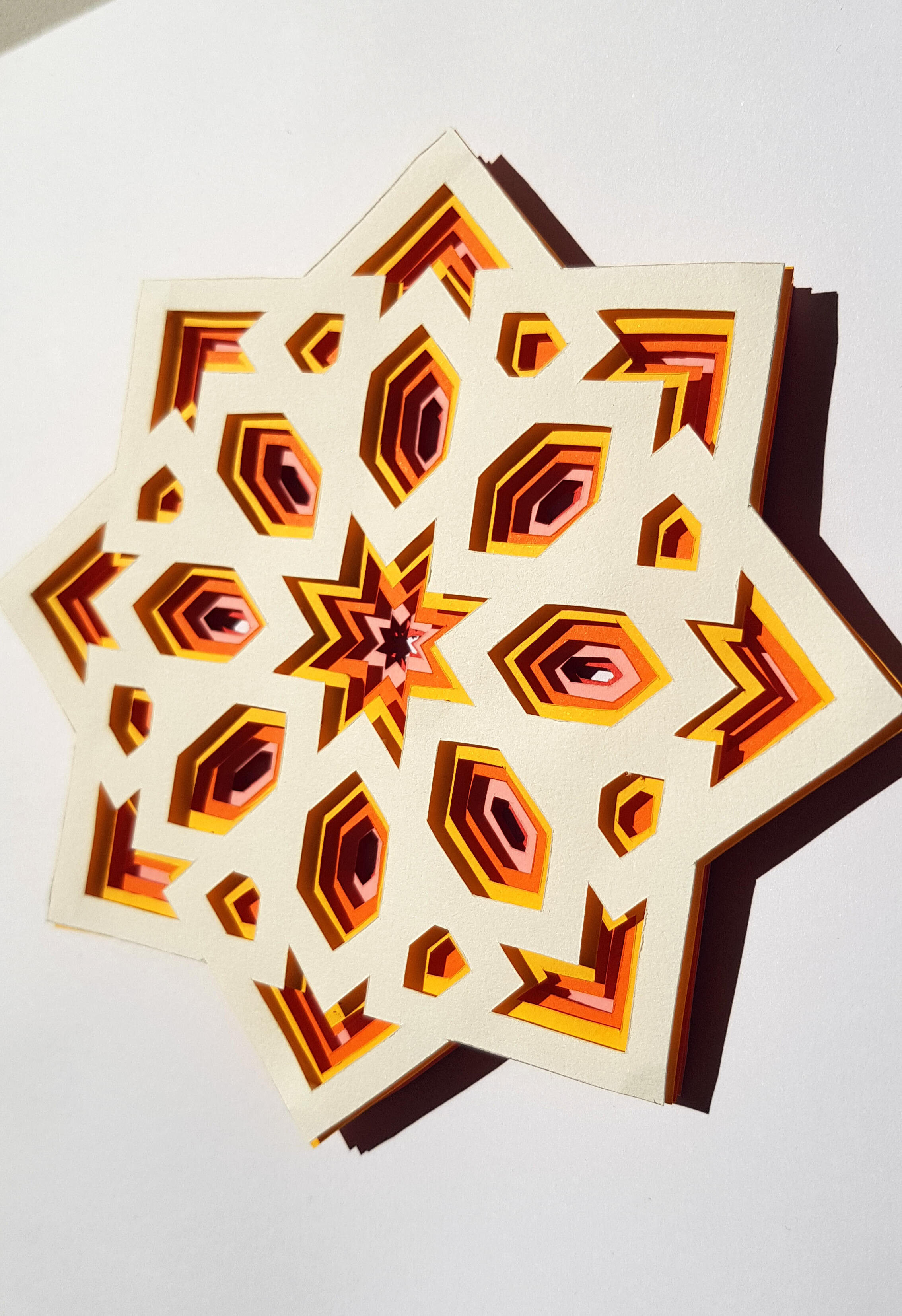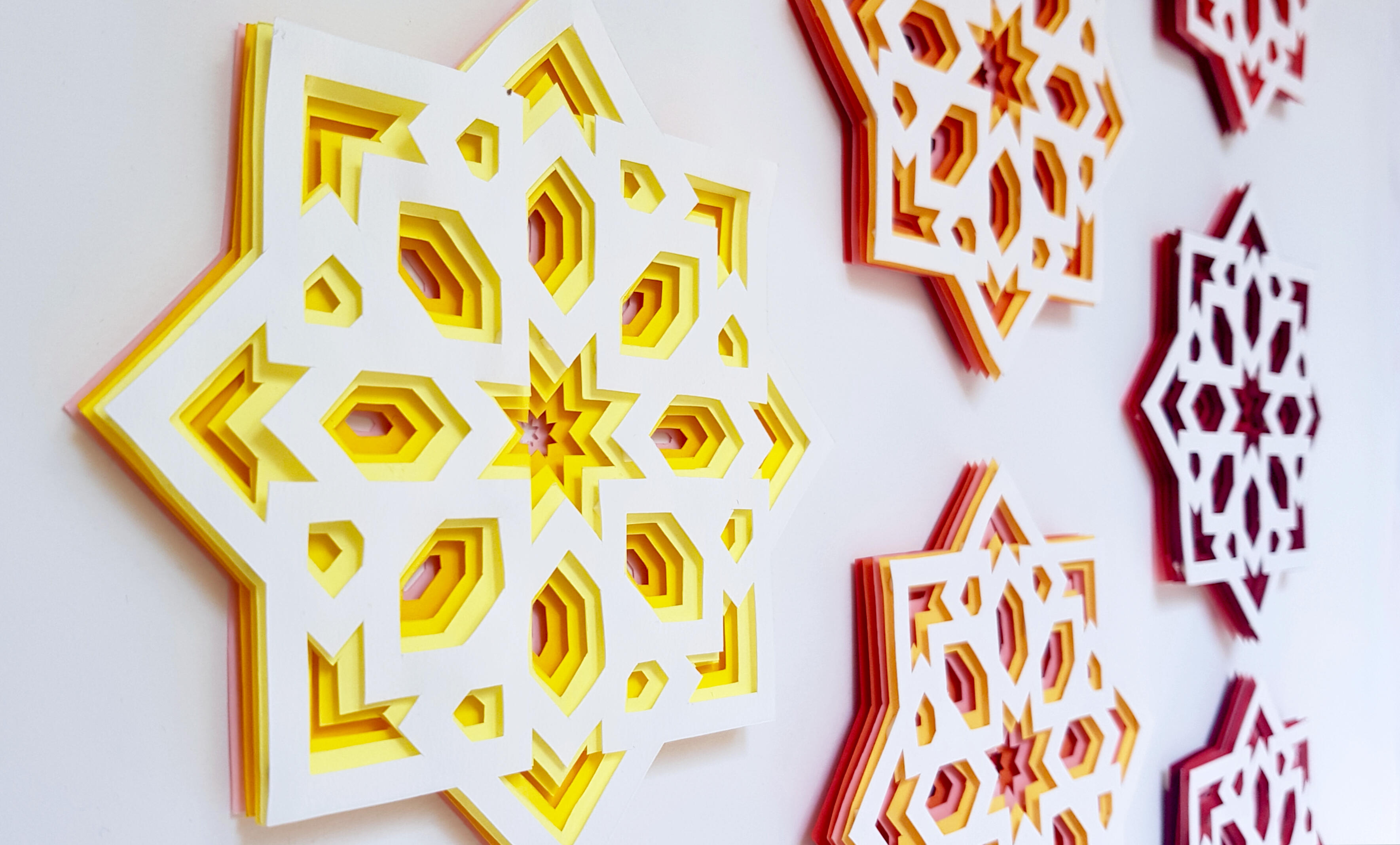 Ainsi, mon travail puise notamment dans les arts islamiques tout en s’inspirant de la nature, de l’Art déco et de la pop culture. A travers ces influences multiples, je souhaite faire dialoguer tradition et modernité.J’ai fait le choix de découper mes œuvres entièrement à la main, sans faire appel aux outils numériques tels que les machines de découpe laser. Ce choix, volontairement artisanal, rend chaque motif unique, même lorsque les formes se répètent. L’irrégularité subtile du geste inscrit dans chaque découpe une singularité, une présence, qui me semble essentielle. C’est une manière d’assumer l’imperfection comme une trace du vivant.