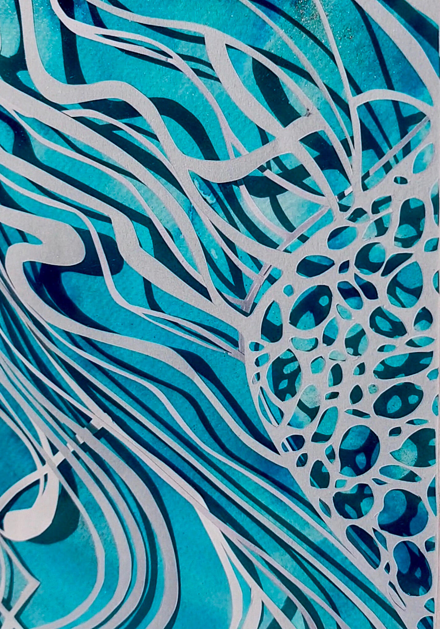 Découpe de papier - 3 feuilles superposées - et fond en aquarelle.