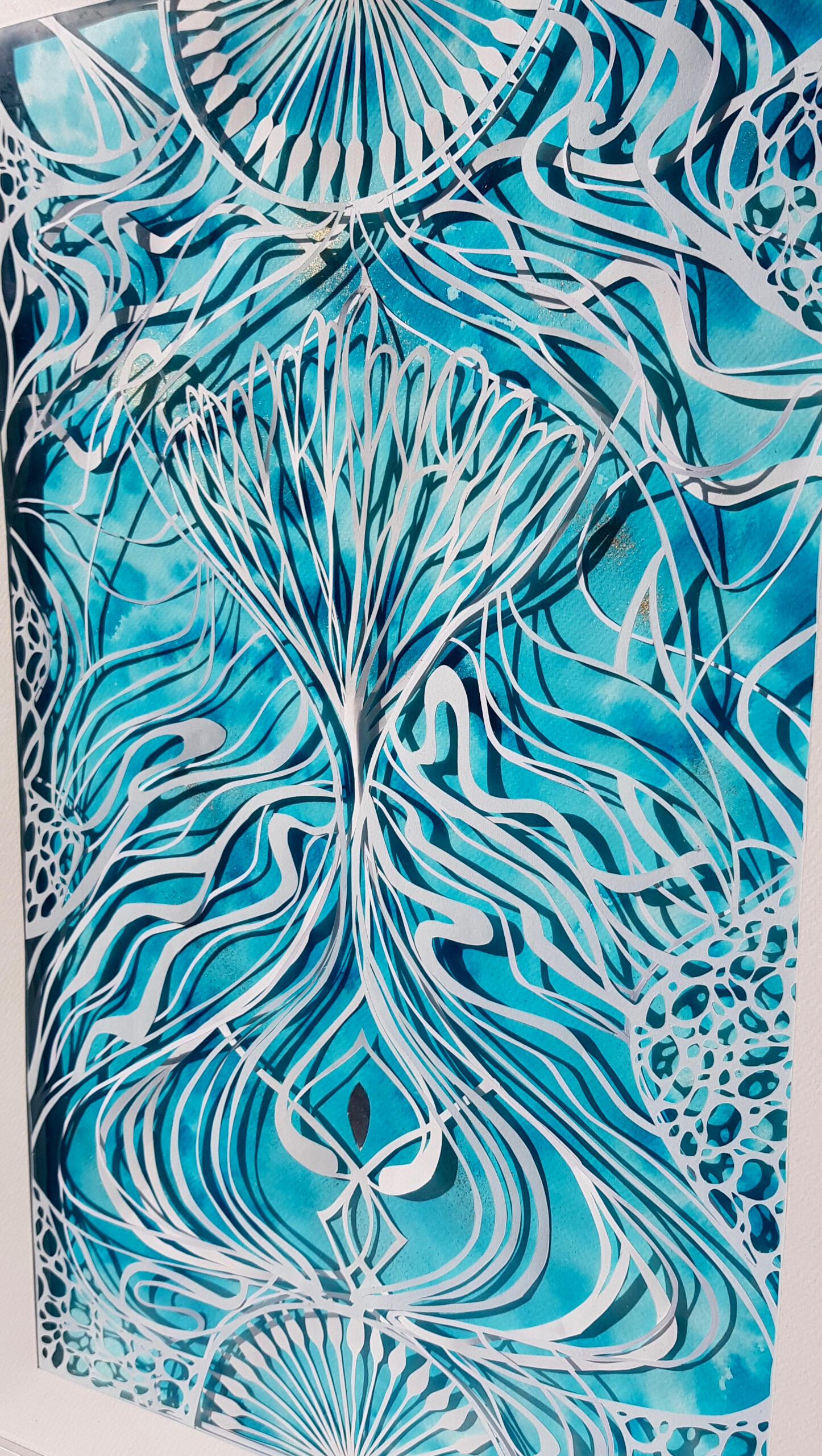 C’est dans la découpe et la superposition que mon langage plastique s’est affirmé. J’aime la fragilité du papier, sa vulnérabilité apparente une fois découpé. Mais c’est précisément cette fragilité qui révèle sa beauté, et plus encore, sa capacité à gagner en force et en profondeur lorsqu’il se lie à d’autres. Il y a là une forme de métaphore du vivant, de nos trajectoires personnelles, de nos relations humaines. Une poésie du lien qui résonne avec mon parcours associatif.Par ailleurs, la géométrie occupe une place importante dans mes œuvres. Elle y installe un cadre, une structure, un rythme. Elle me renvoie à l’ordre profond qui régit le monde : les lois de la nature, les proportions du corps humain, les motifs invisibles de l’univers. Pourtant, c’est précisément à l’intérieur de ces formes ordonnées que j’exprime ce qu’il y a de plus libre, de plus vivant. Chaque découpe, chaque élément trouve sa place, à sa manière, dans cet équilibre entre rigueur et spontanéité. Ce dialogue entre structure et expression est au cœur de ma recherche artistique.